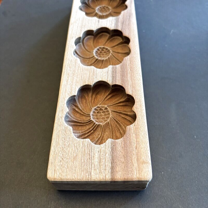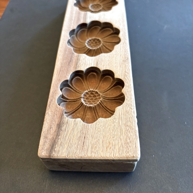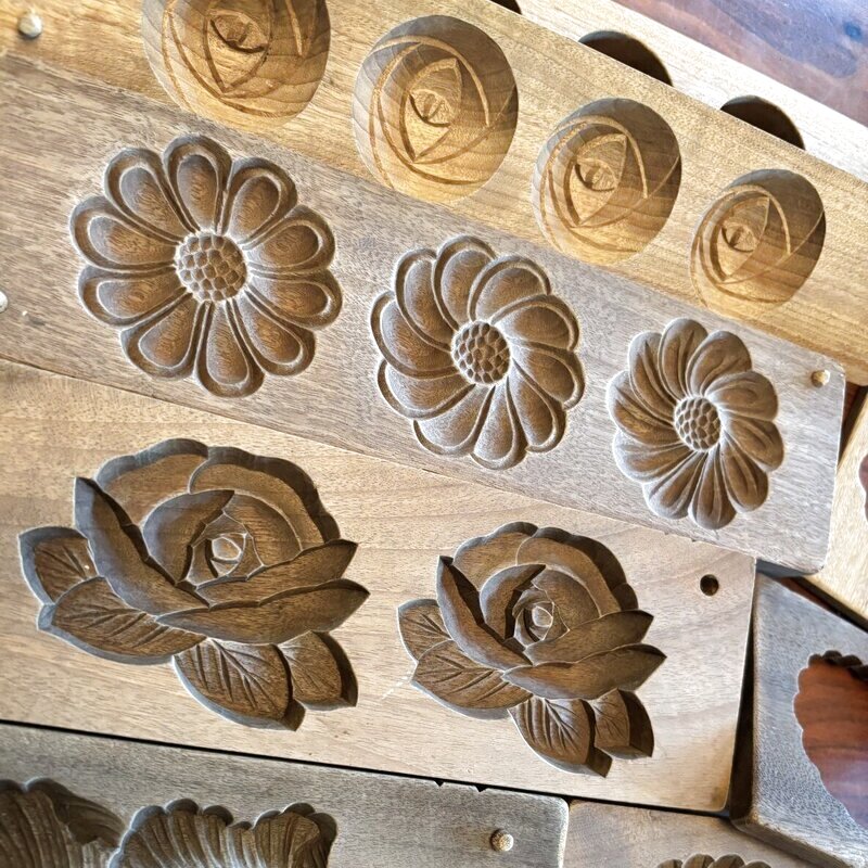 長年、菓子職人さんたちに大事に使われてきた木型達、日本の木型職人さんの彫りは繊細で素晴らしい。