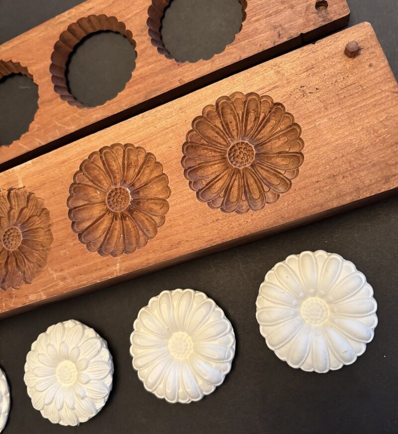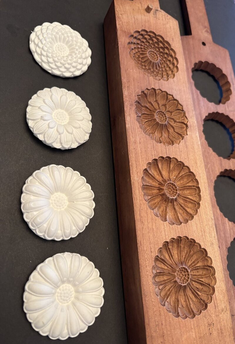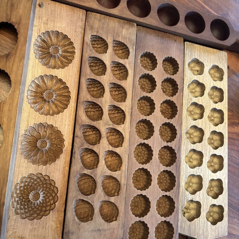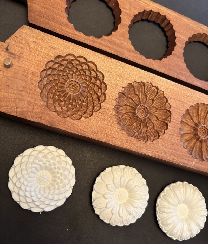長年、菓子職人さんたちに大事に使われてきた木型達、日本の木型職人さんの彫りは繊細で素晴らしい。
