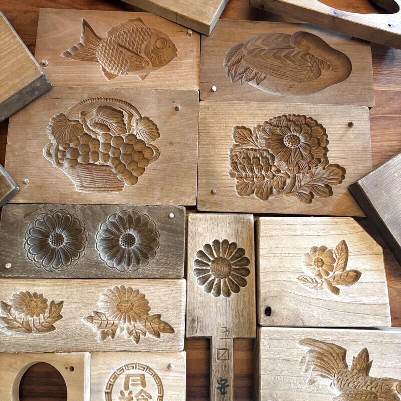 長年、菓子職人さんたちに大事に使われてきた木型達、日本の木型職人さんの彫りは繊細で素晴らしい。