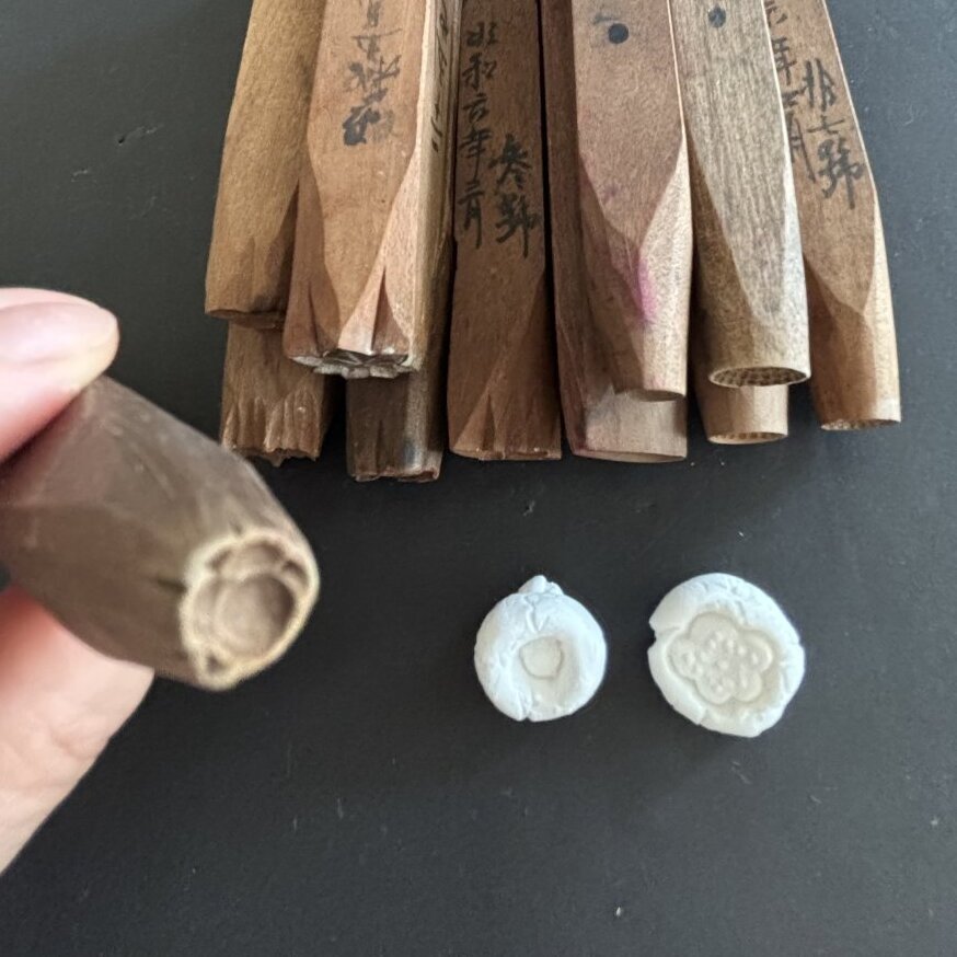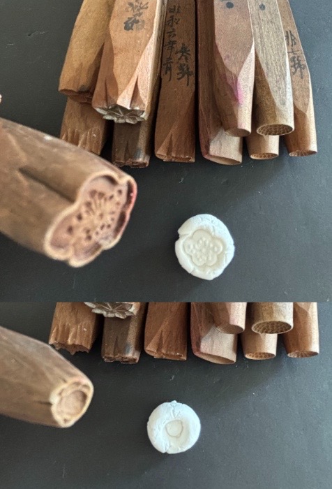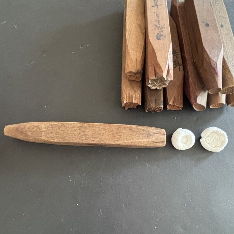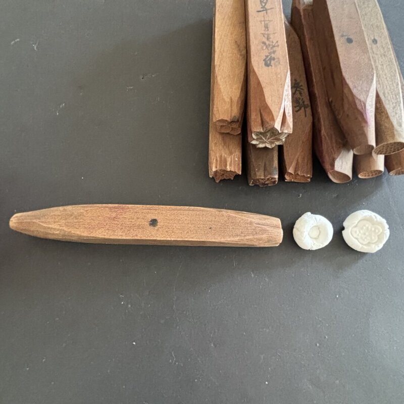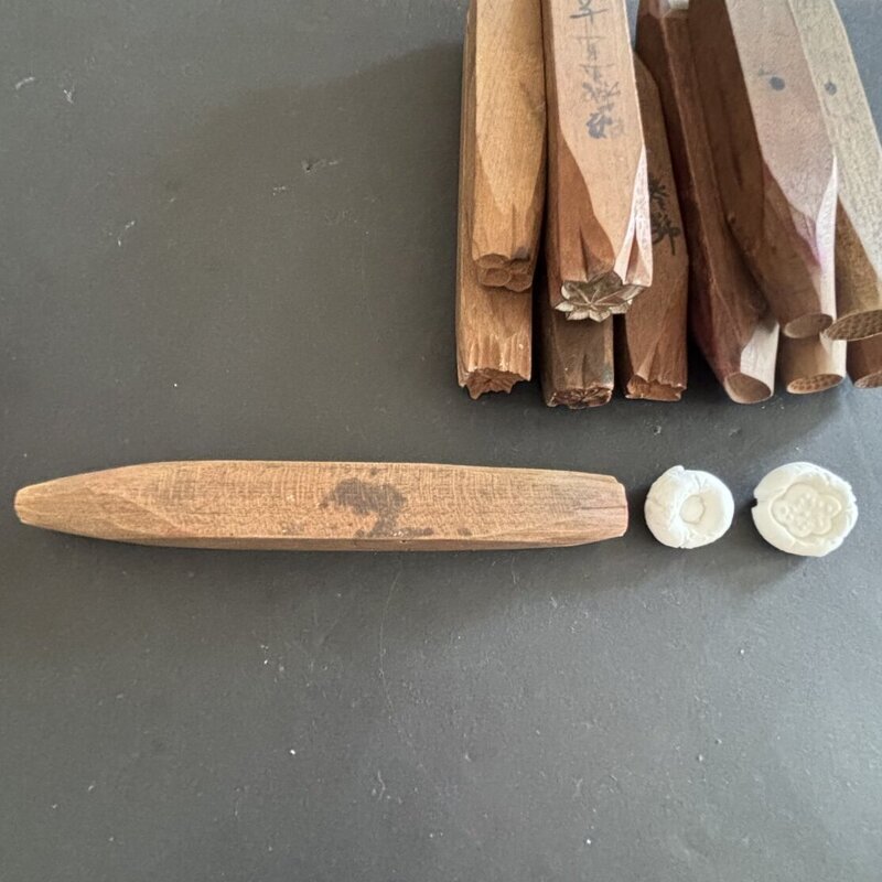棒の両端にそれぞれ型が彫ってあり、押して絵柄をつけます。