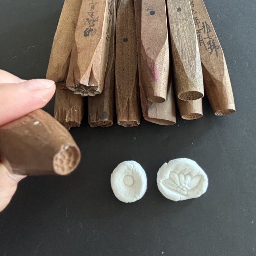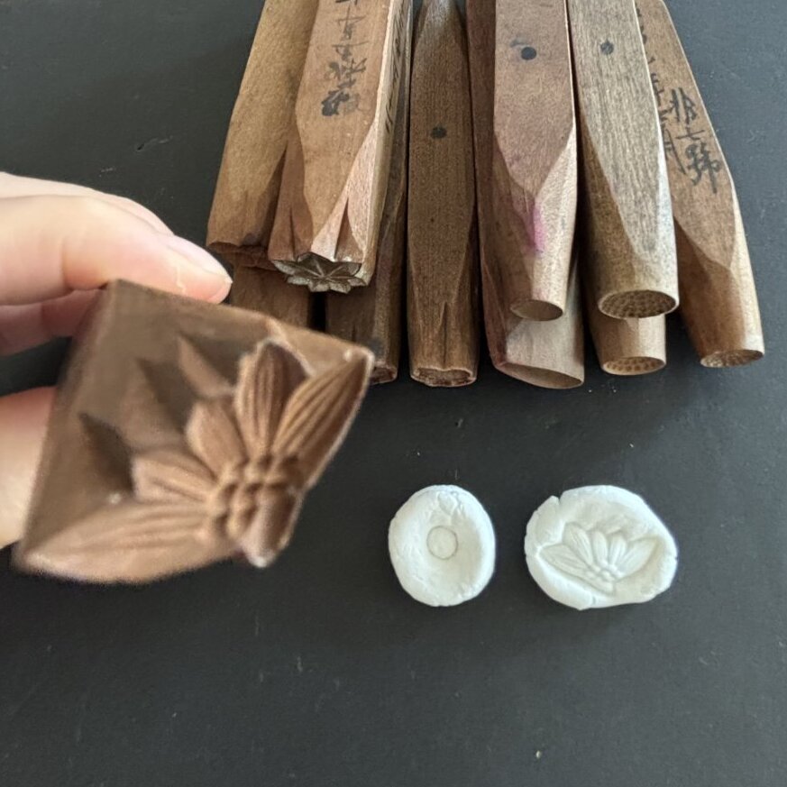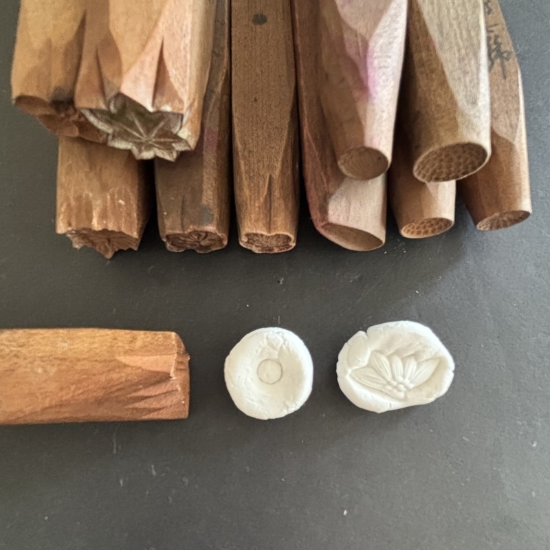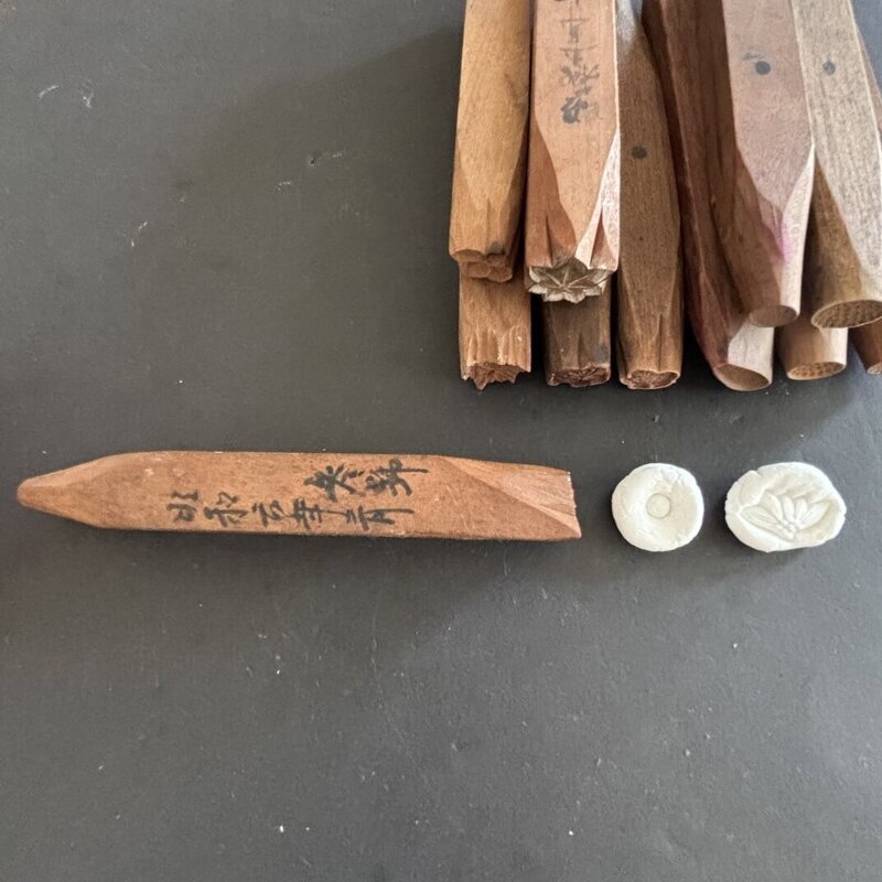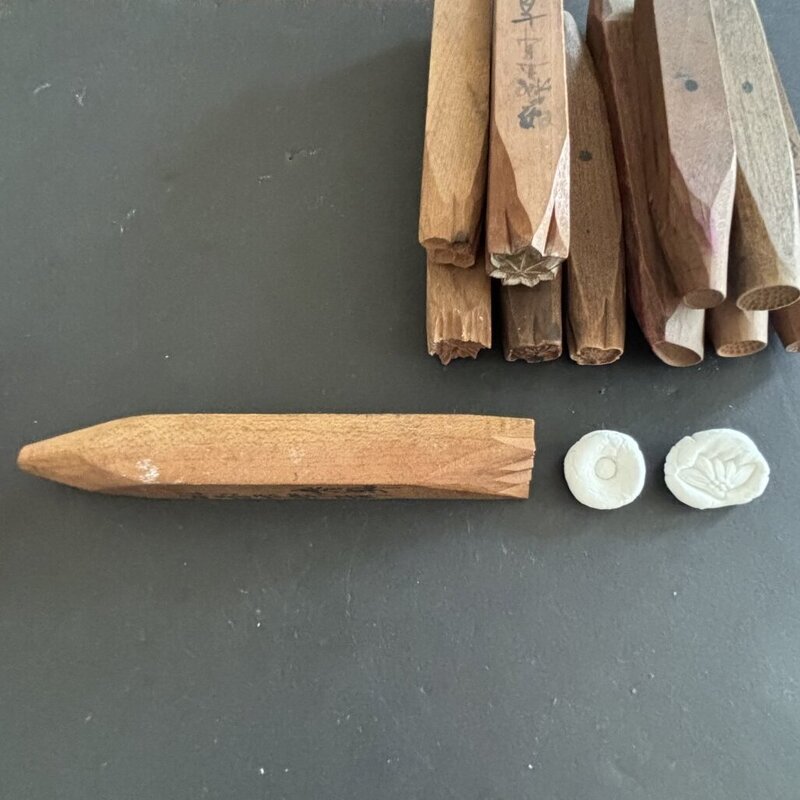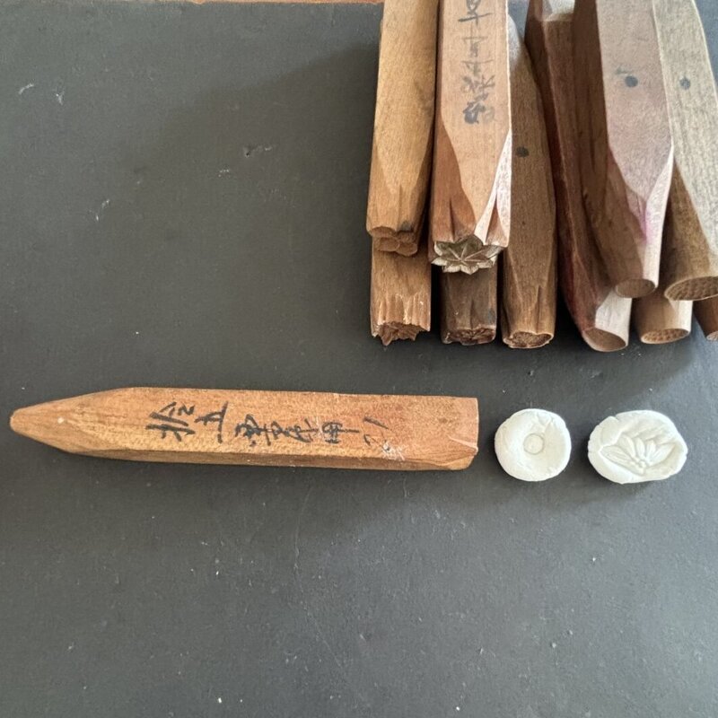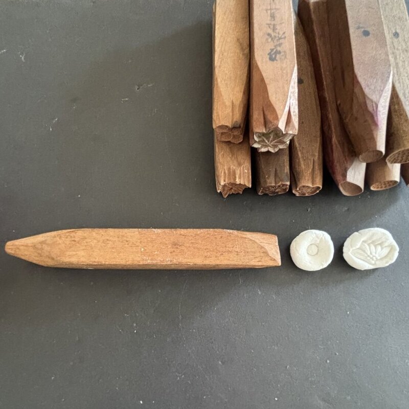 棒の両端にそれぞれ型が彫ってあり、押して絵柄をつけます。