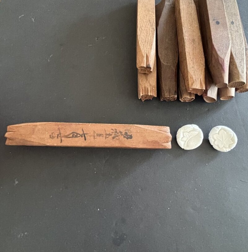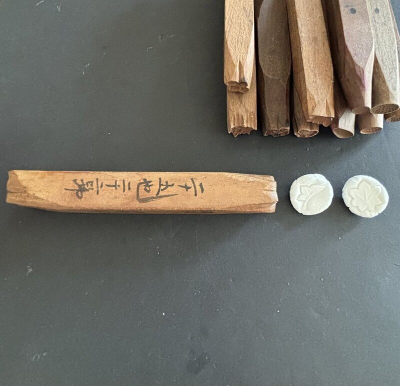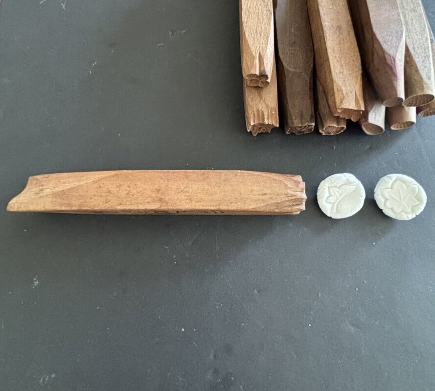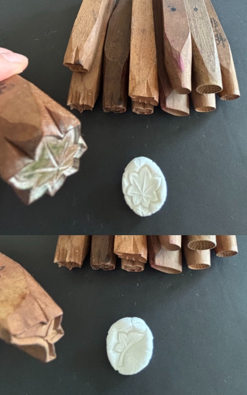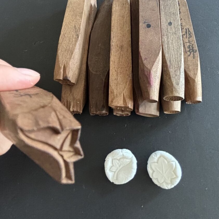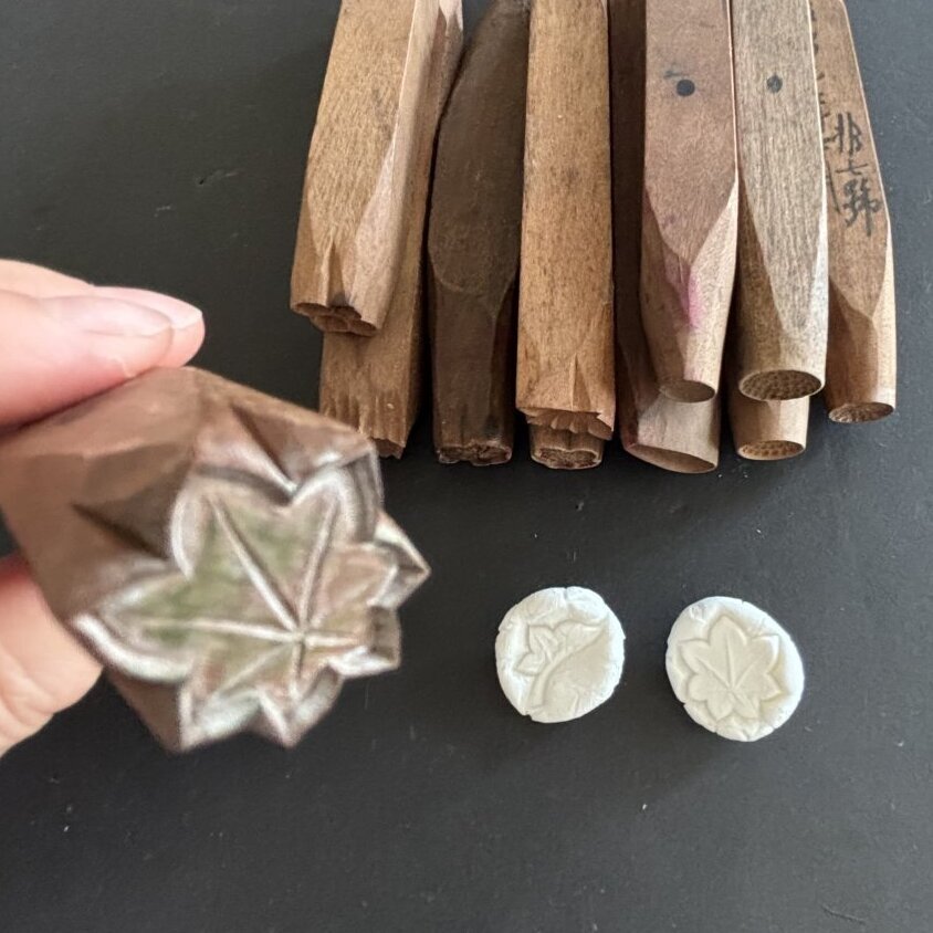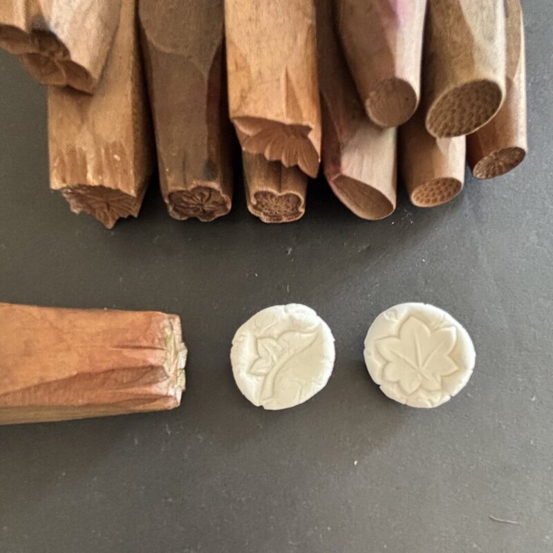 棒の両端にそれぞれ型が彫ってあり、押して絵柄をつけます。