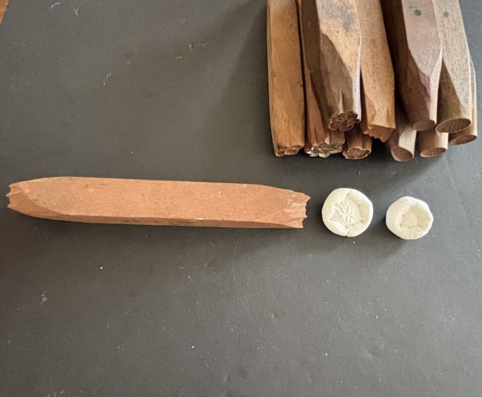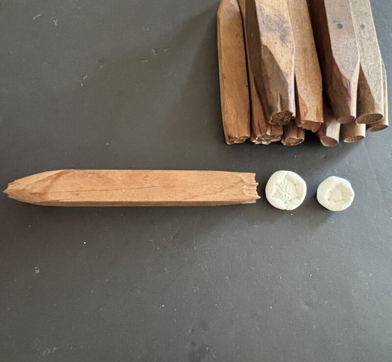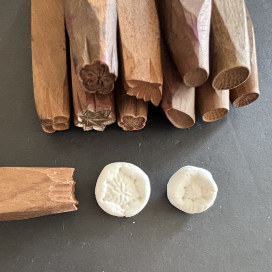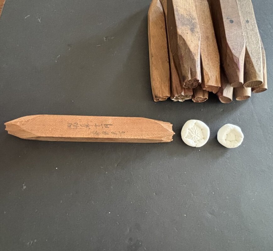 棒の両端にそれぞれ型が彫ってあり、押して絵柄をつけます。