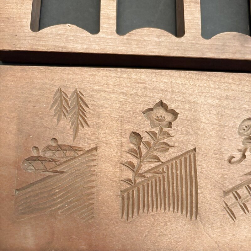 長年、菓子職人さんたちに大事に使われてきた木型達、日本の木型職人さんの彫りは繊細で素晴らしい。