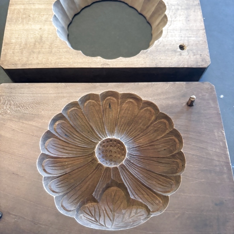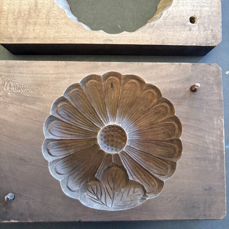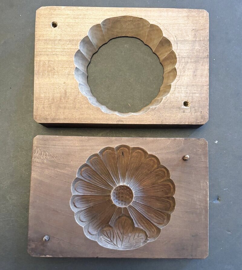 長年、菓子職人さんたちに大事に使われてきた木型達、日本の木型職人さんの彫りは繊細で素晴らしい。
